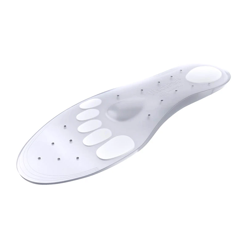 The ViscoPed orthoses feature long soles and special pressure relief zones that deflect typical pressure peaks and distribute them evenly across the foot. The inlays also gently support the longitudinal arch, thus helping to counteract pes planus (flat feet). Their shock-absorbing effect also protects the ankle, knee hip and spine.