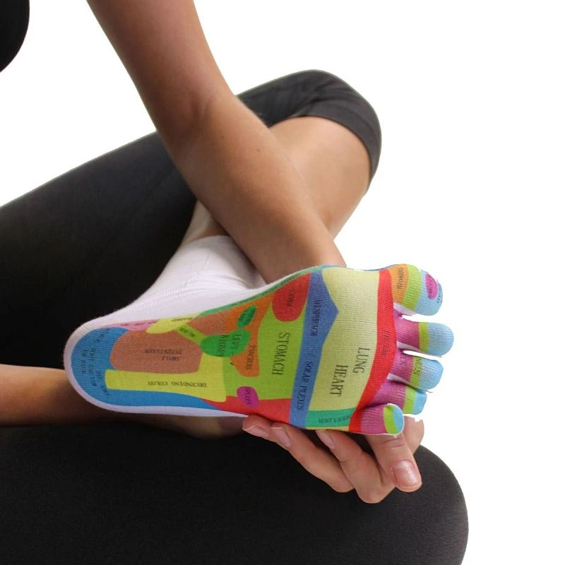 - Comfortable toe socks with a map of the foot’s pressure points printed on the sole